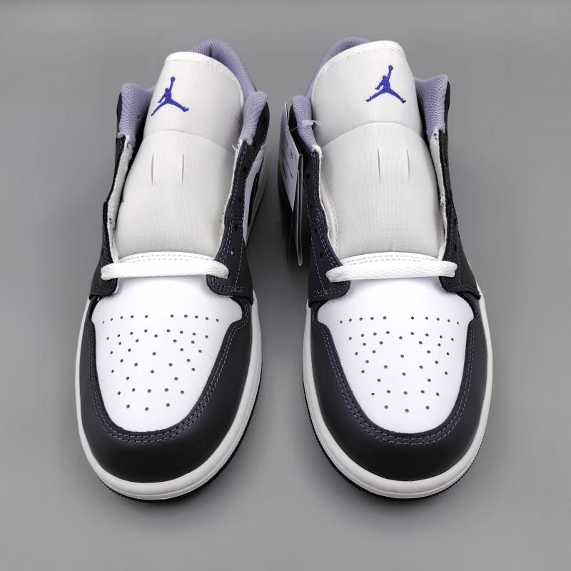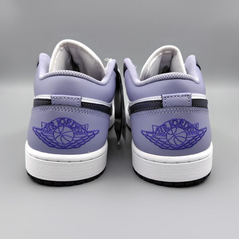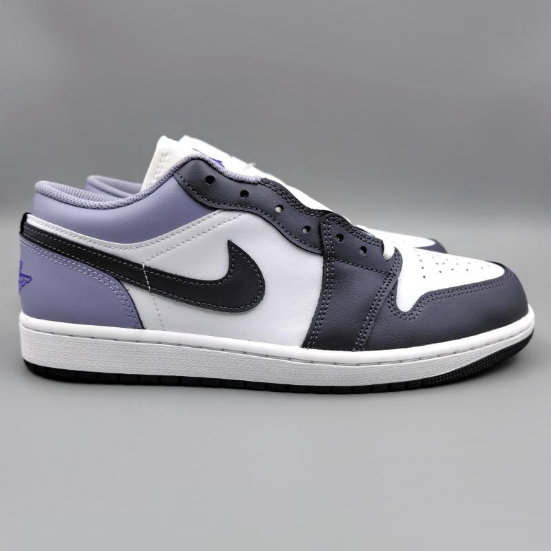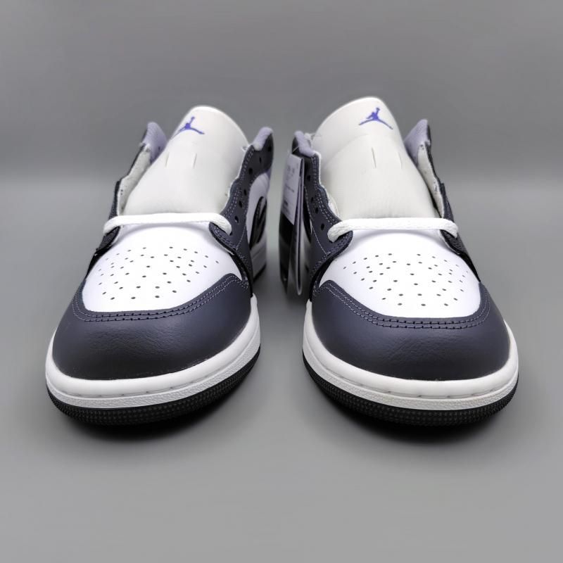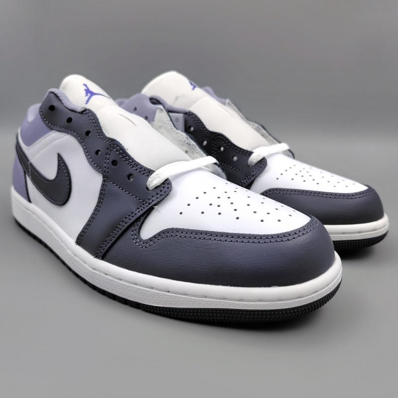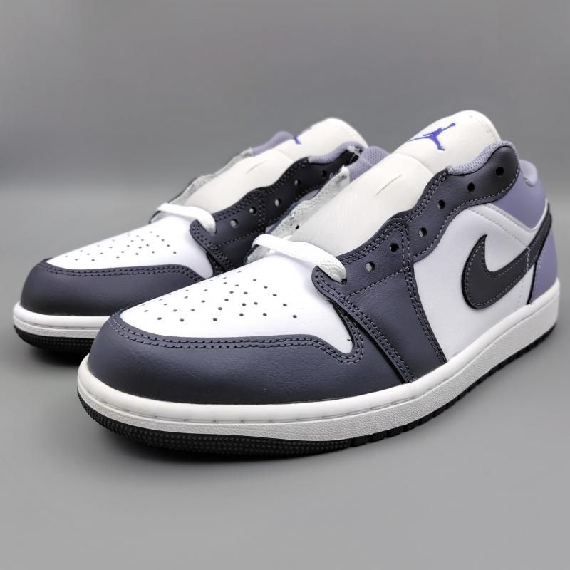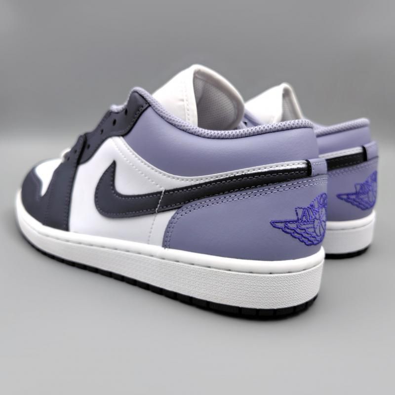 ホワイト/ダークブルーグレー/パープルコメット/インディゴヘイズのシンプルなカラーブロックのAIR JORDAN 1 LOW。ダークブルーグレーのオーバーレイとスウッシュ、インディゴヘイズのソール、ホワイトのアッパーとサイド、パープルコメットのヒール、バランス良い配色のエア ジョーダン 1 ロー。